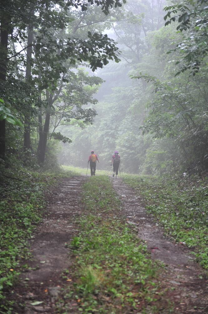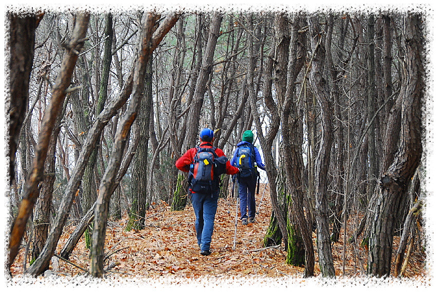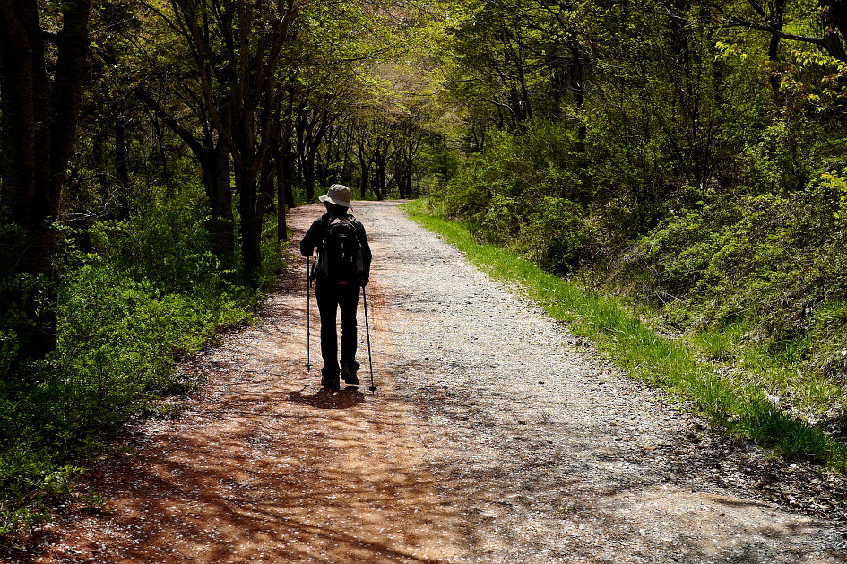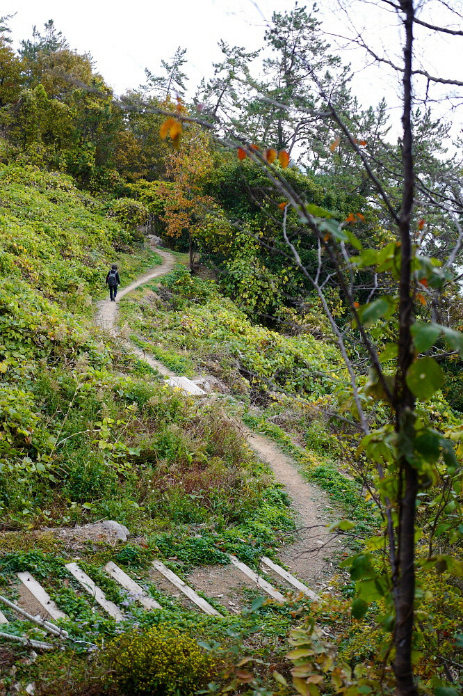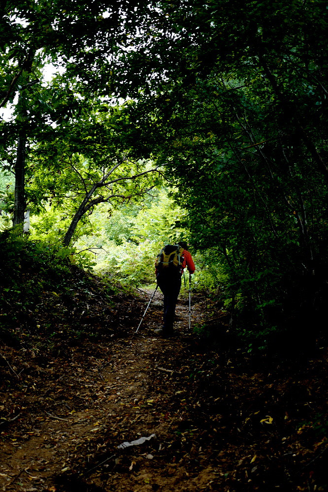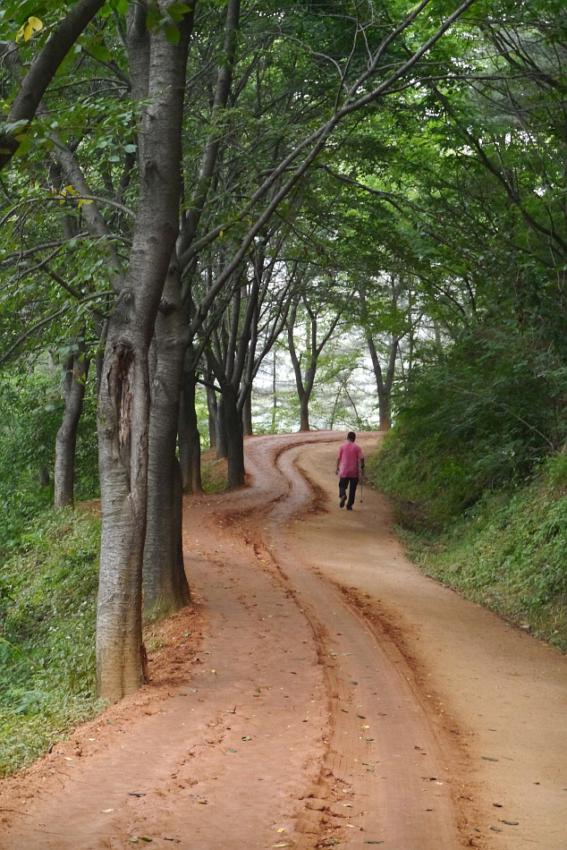 대축마을에서 원부춘마을로 이어지는 지리산 둘레길을 걷다가 윗재 고개의 숲길을 넘어가는 모습이 고독해보인다.
