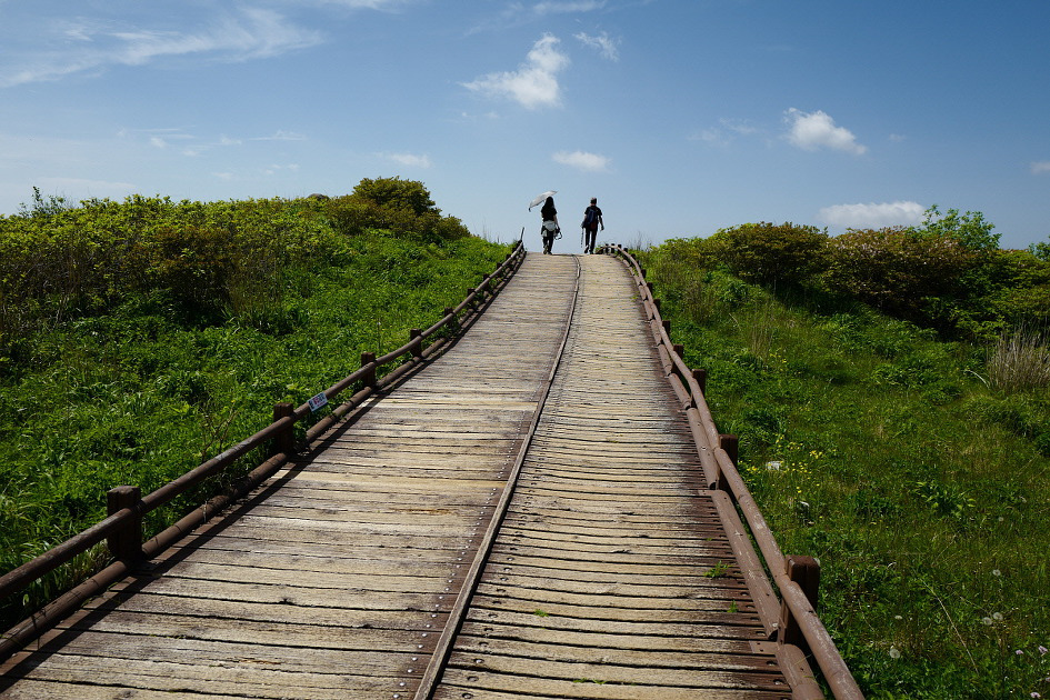 지리산 노고단 정상으로 이어지는 데크길에서 하늘을 배경으로 걷는 산행객의 뒷모습이 아늑하다.
