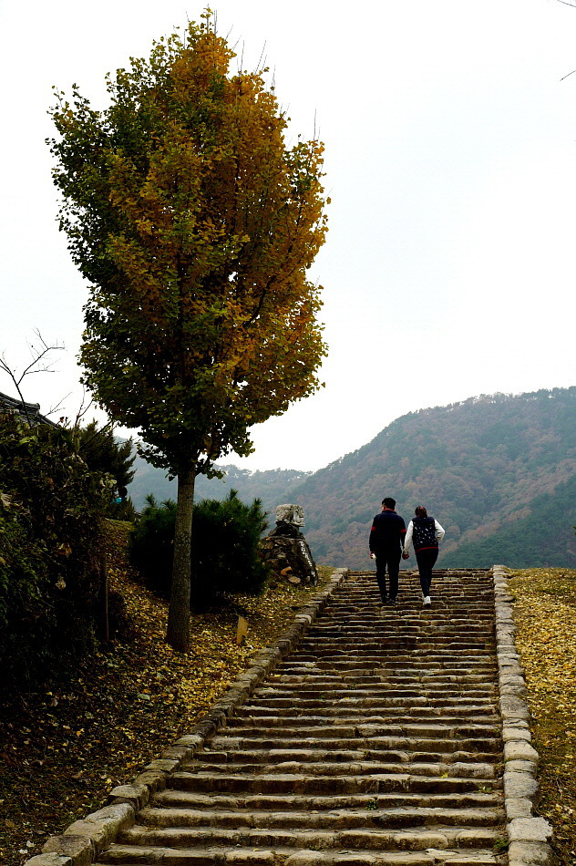 산막이옛길에서 손을 잡고 계단을 오르는 연인의 모습이 옆에 서있는 귀여운 나무와 묘한 조화를 이룬다.