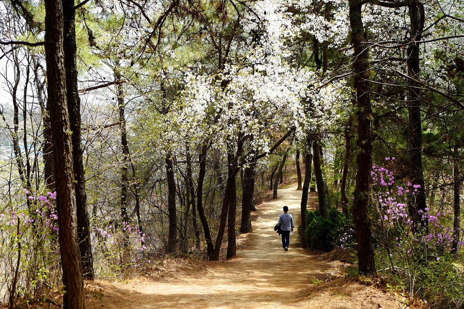 산벚꽃과 진달래가 피어있는 오봉산의 편안한 맨발 등산길을 걷는 모습이 평화롭다.