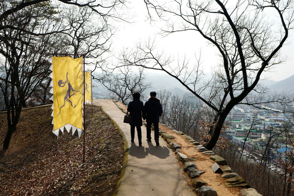 공주 시가지를 바라보며 공산성 성곽길을 걷는 연인의 모습이 정겨운 그림자를 남긴다.