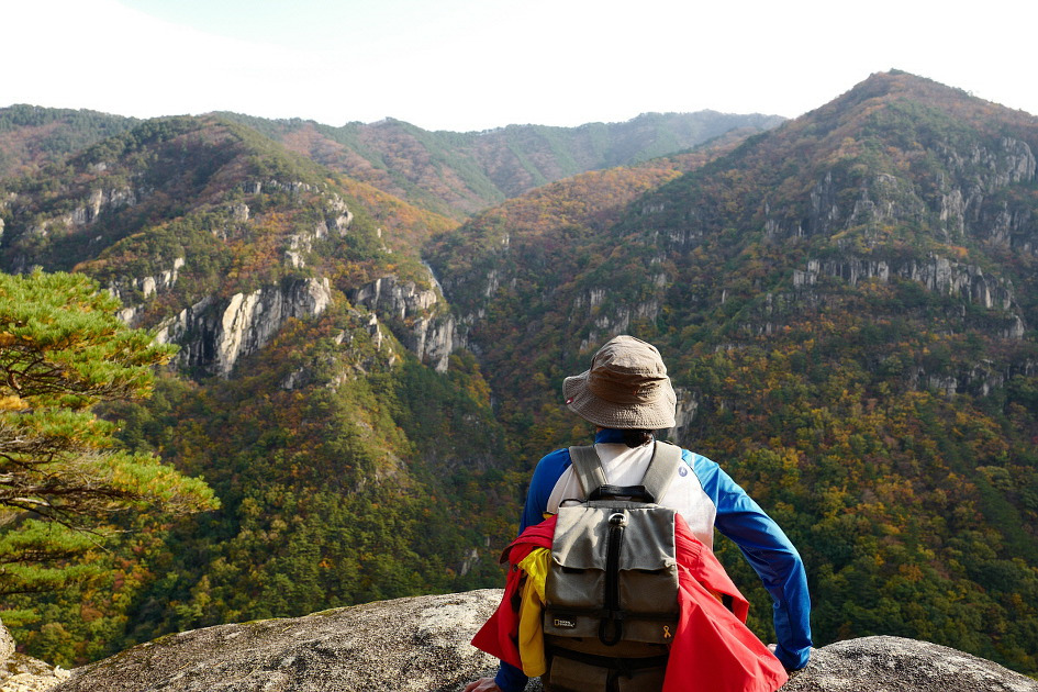 속리산 산행에서 경업대에 올라 시원하게 펼쳐지는 조망을 감상하는 사람들의 모습이 무척 자연스럽다.