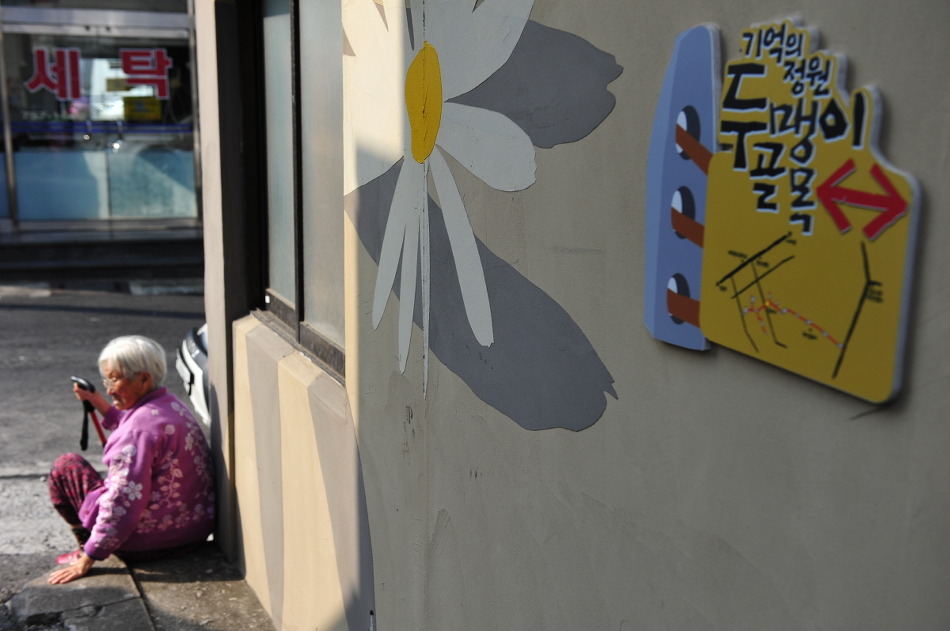 제주 올레길의 원조라고 할 수 있는 두맹이 골목에서 햇살을 쬐고 있는 할머니 모습은 오래된 골목과 묘한 동질감이 느껴진다.