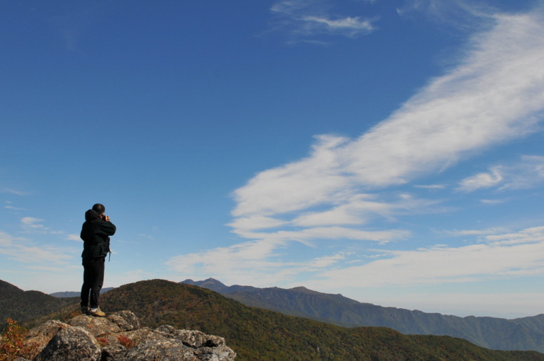 남덕유산 정상 능선에서 주변의 시원한 풍광을 바라보는 모습이 푸른 하늘을 배경으로 멋지게 펼쳐진다.